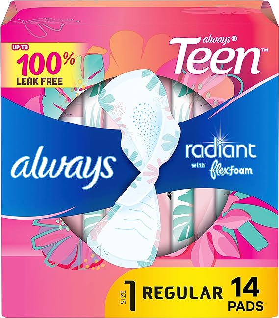 Always Radiant Teen Feminine Pads For Women, Size 1 Regular Absorbency, With Flexfoam, With Wings, Unscented, 14 Count
