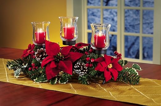 The season’s favorite centerpiece is an “evergreen” arrangement of faux poinsettias, winter greenery and pinecones